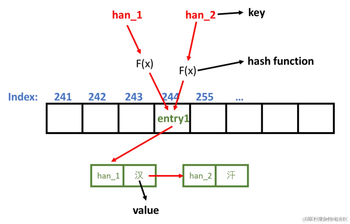 因为哈希表中 key 必须是唯一的,所以图示给拼音加了后缀 _1 和 _2。key han_1 和 han_2 通过哈希函数 F(x) 计算出来的页码都是 244。这时就产生了哈希碰撞。为了解决碰撞问题,新建了一个链表,链表的每个结点都包含了一个键值对,当输入 key han_2 时,哈希表在 244 位置找到了键值对 [han_1 - 汉] ,但是通过比对发现找到的键值对的 key 是 han_1,不等于 han_2,所以继续遍历到链表的下一个结点,下一个结点存放了键值对 [han_2 - 汗] ,通过比较发现 key 确实是 han_2,因此返回了汉字(value)汗。