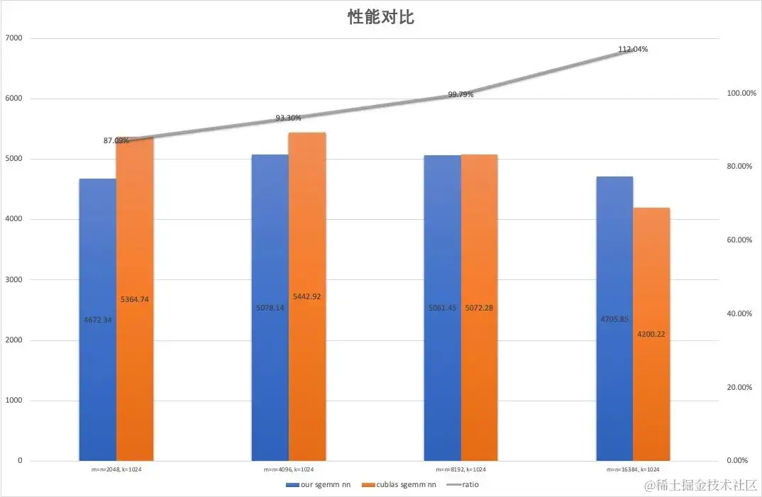 可以看到所实现的 SGEMM Kernel 达到了 cublas 平均 97.5% 的性能。