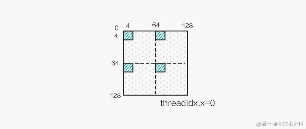 同时,我们的 kernel 为 256 个线程计算 128x128 的分块,为了能够合并访问 Shared Memory,我们将 256 个线程划为二维,令: