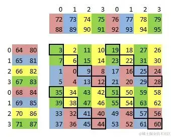 最终单个线程计算 2x2 个 4x4 的结果,结果布局如图所示: