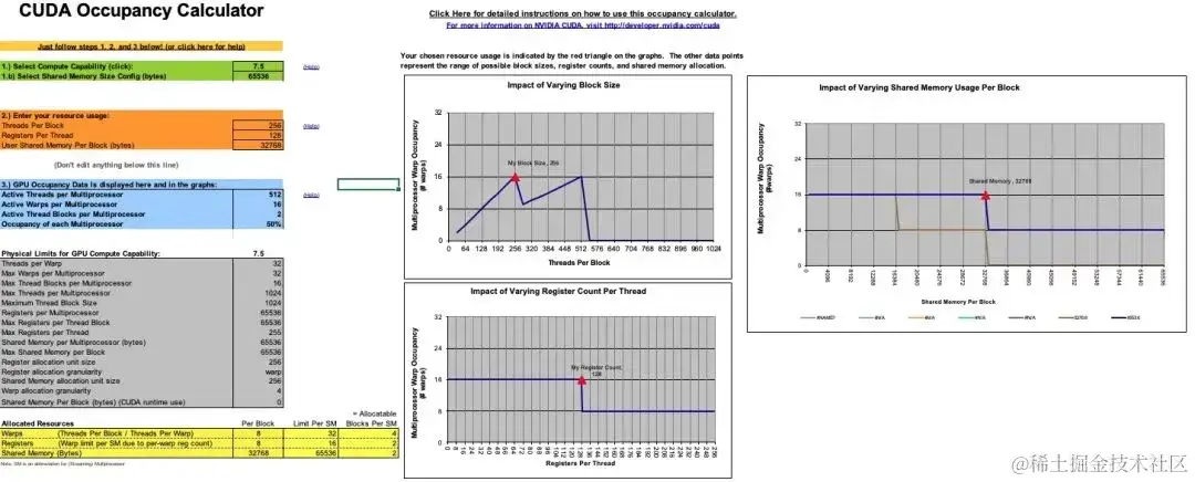考虑一个 block 计算 128x128 的分块,若每个线程计算 128 个结果,需要的 block size 为 128,单个线程需要 128 个寄存器储存计算结果,加上所需的 Gmem to Smem,Smem to Reg 等一些所需的寄存器,大概共需要至少 180 多个,计算 Occupany 可知此时的 Active Warp 数只有 8,Occupany 为 25%;若设置 block size 为 256,则每个线程仅需计算 64 个结果,调整寄存器和 Shared Memory 的使用量并观察 Occupany,可知若每个线程只使用 128 个寄存器,block 内的 Shared Memory 使用量限制在 32K,Active Warp 数可以达到 16,是一个更优的选择: