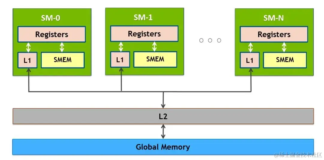 分析代码我们可以看到,计算一次 FMA(乘累加)之前需要读一次 A 和读一次 B,众所周知,读取 Global Memory 的代价很大,通常都需要几百个 cycle(时钟周期),而计算一次 FMA 通常只需要几个 cycle,大量的时间被花费在了访存上。也许有思维活络的同学立马想到,可以将 A 和 B 矩阵先搬运到 Shared Memory(SM 中低延迟的 on-chip memory,block 内线程共享,附 NVIDIA GPU 内存结构图)中降低访存的开销,这的确是一个很好的思路,但是这只能将访存代价从几百 cycle 降低到几十 cycle,并不改变问题的本质。问题的关键在于主体循环由两条 Load 指令与一条 FMA 指令构成,计算指令只占总体的 1/3,计算访存比过低,最终导致了访存延迟不能被隐藏,从而性能不理想。
