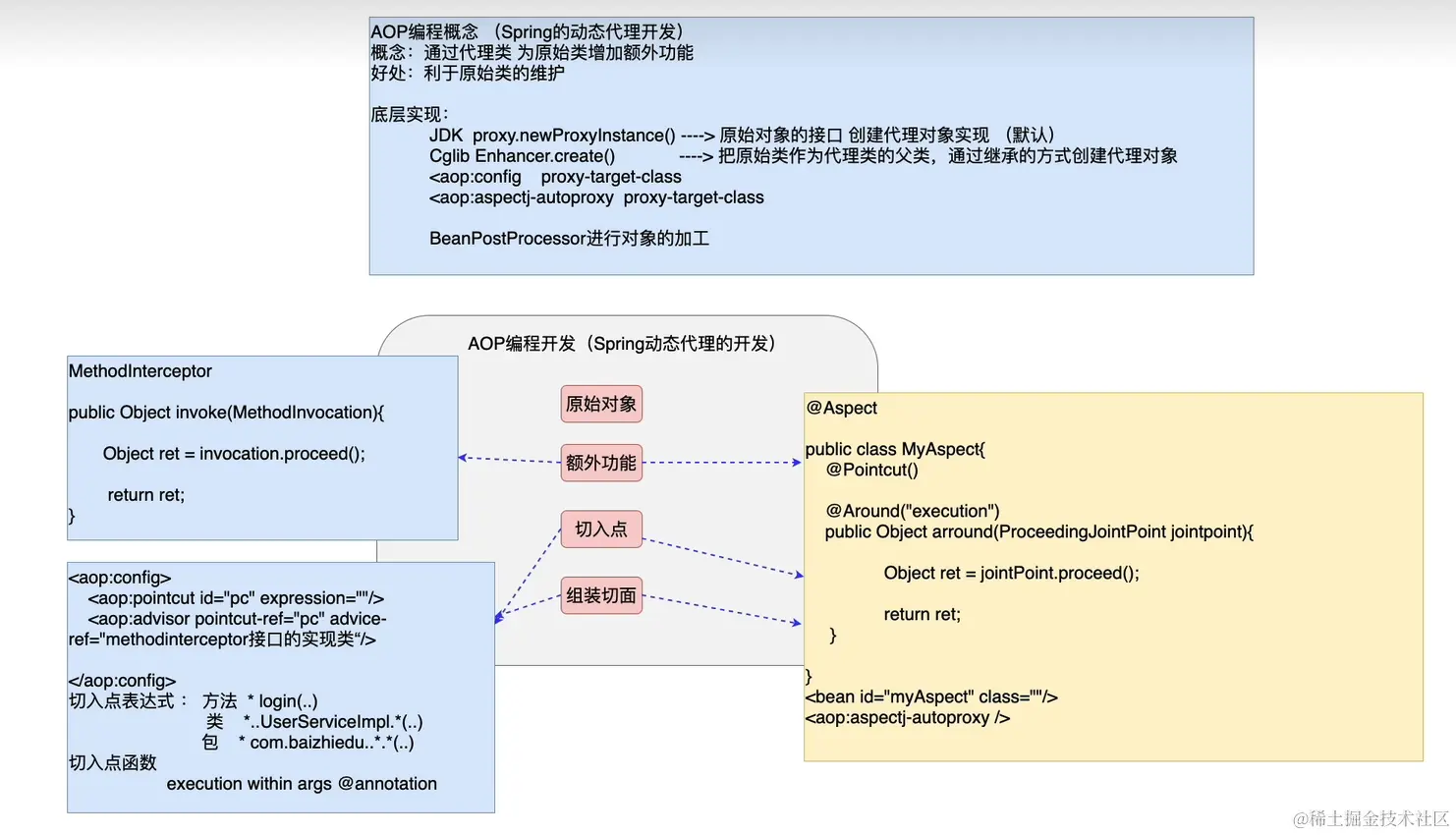 AOP(Aspect Oriented Programing)面向切面编程 = Spring动态代理开发 以切面为基本单位的程序开发,通过切面间的彼此协同,相互调用,完成程序的构建 切面 = 切入点 + 额外功能