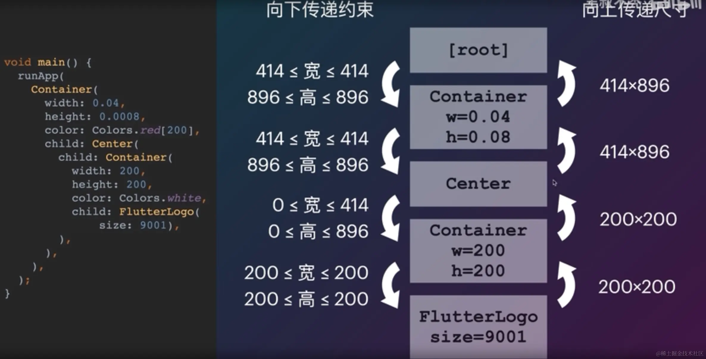 1,flutter的约束是从上往下传递的。尺寸是从下往上传递的。