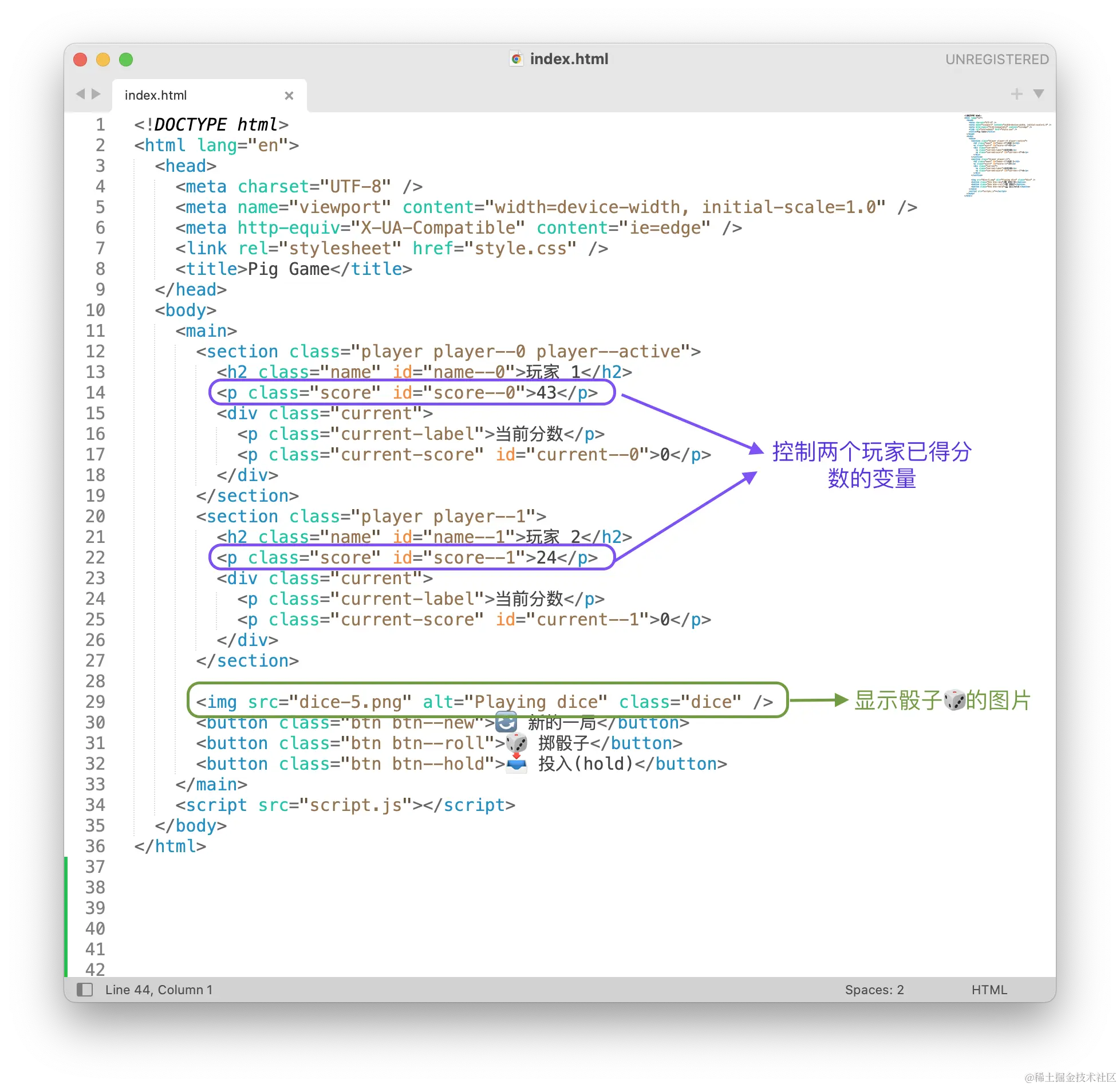 class="score" id="score--0"和class="score" id="score--1")需要进行改动 - 目前还没有开始游戏,需要将游戏中间的骰子🎲隐藏起来。因此我们需要创建一个样式为