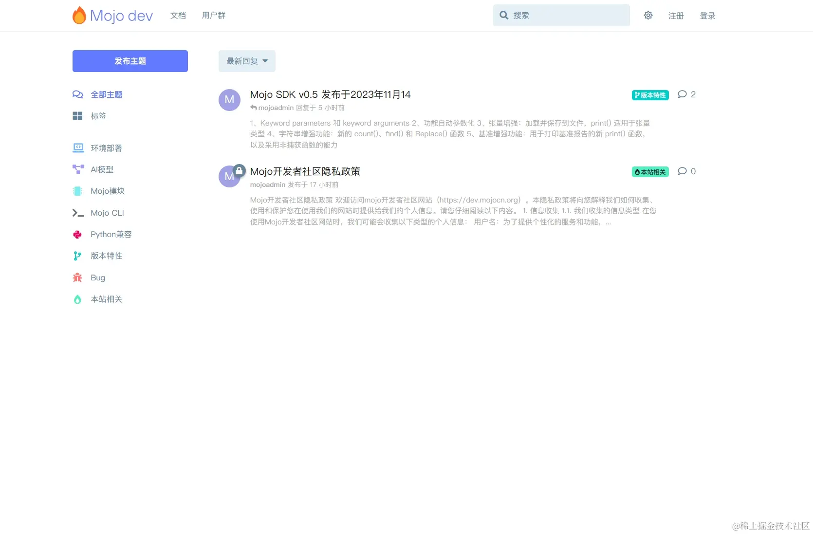 目前社区由Flarum程序建成,Flarum是一个基于php的轻量论坛程序。希望有一天Mojo成熟后能够使用Mojo实现一个平替的项目。
