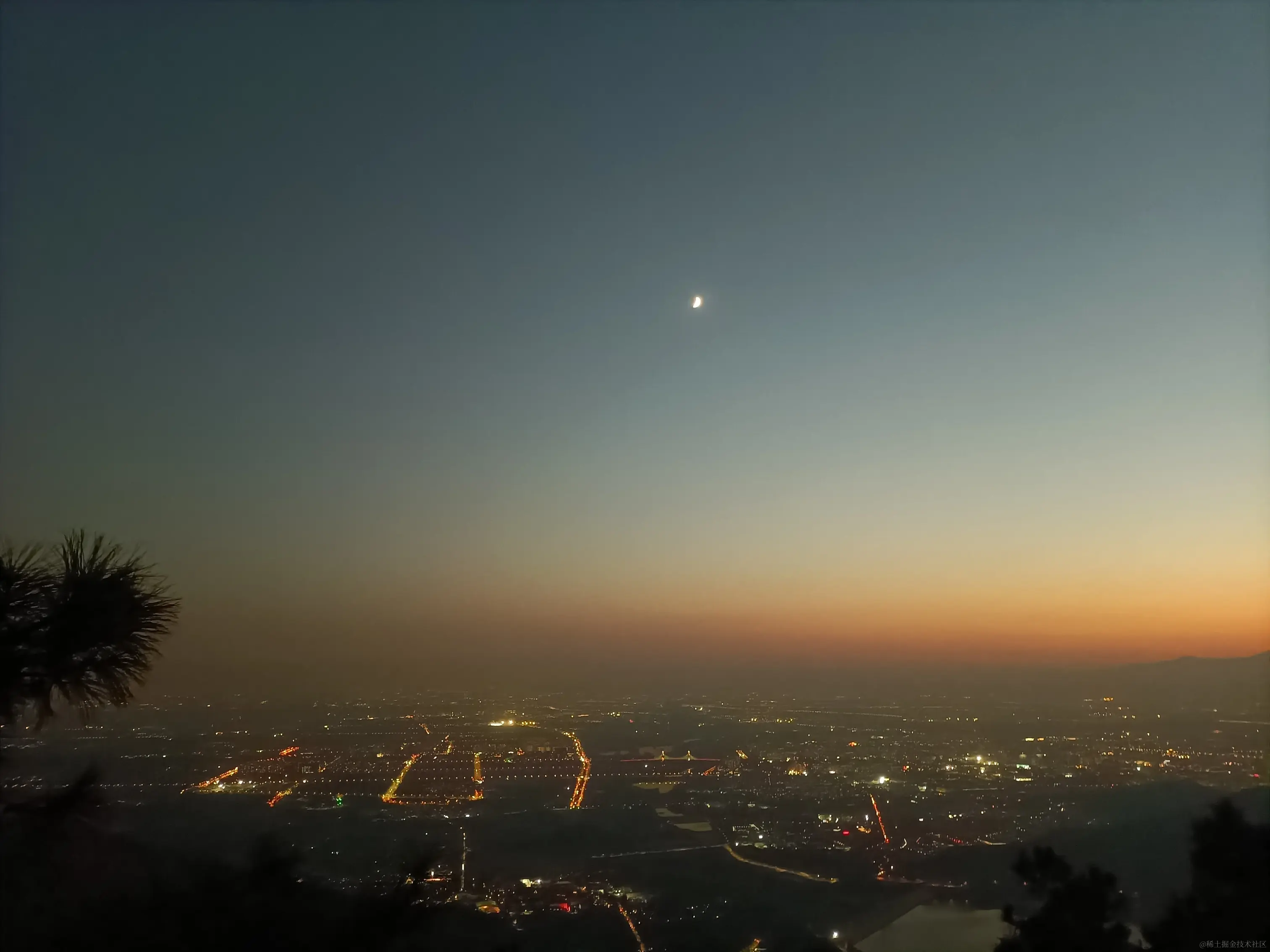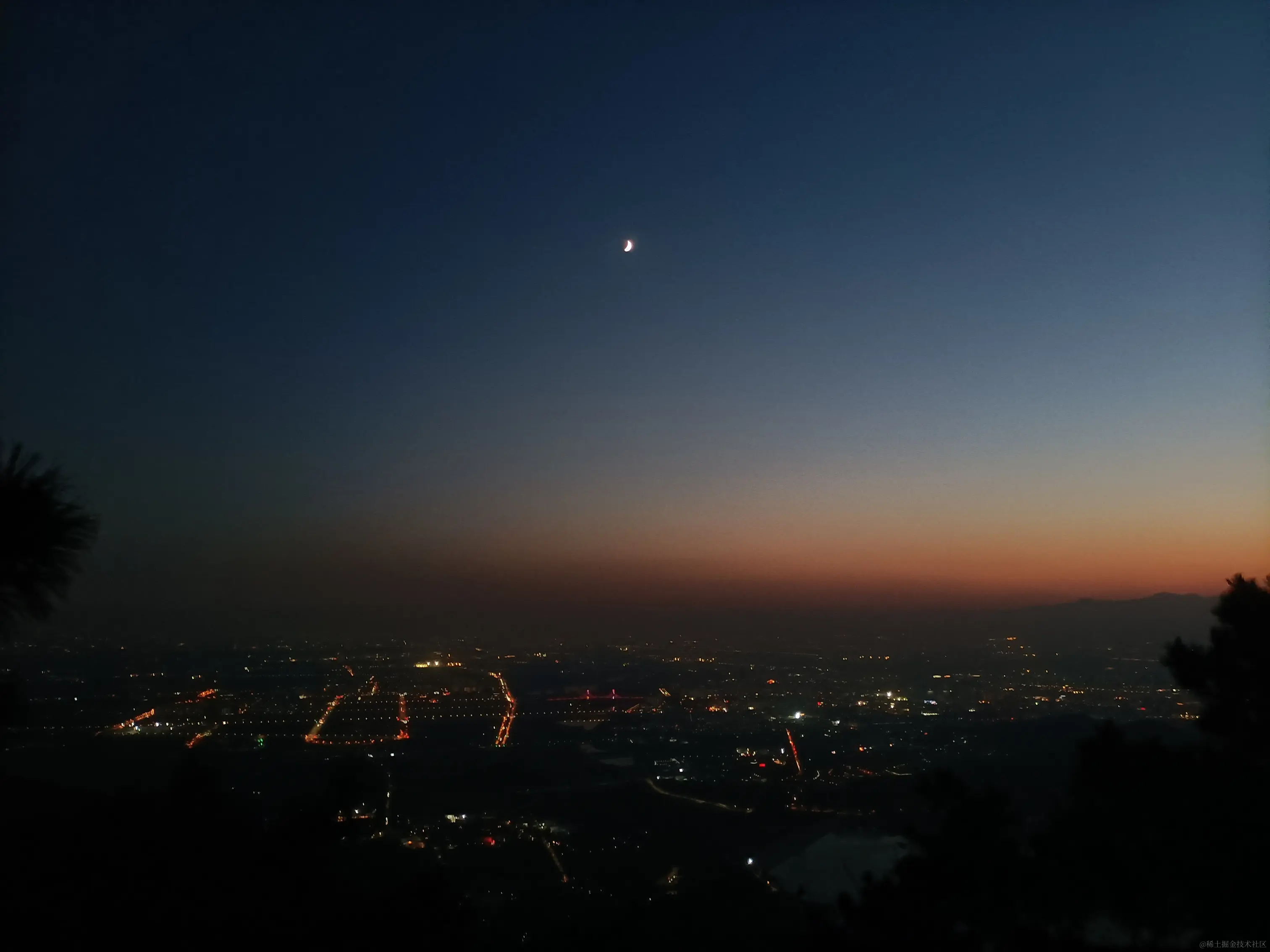 可能是冬天+北方吧,天黑得比较快,这会儿月亮也出来了,人们也点起了灯火,从山顶上望去,夜景还是挺好看的。