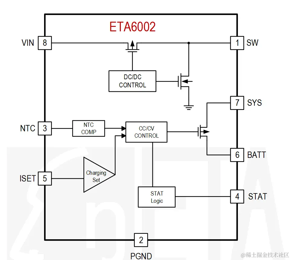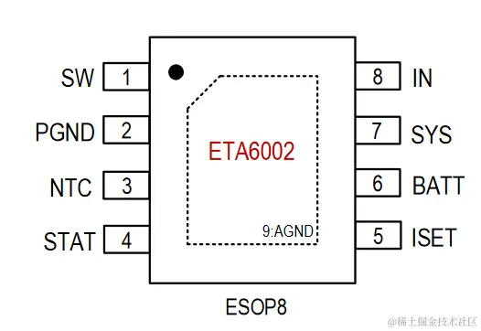 快速充电电流由ISET引脚编程决定。当电池电压达到终端电压,即4.2V时,充电路径断开SYS到BATT的连接。ETA6002还包括当SYS负载电流超过DCDC调节器的电流限制在内部设置,SYS电压降至VBATT以下,ETA6002打开电源路径,通过电池补充系统负载。