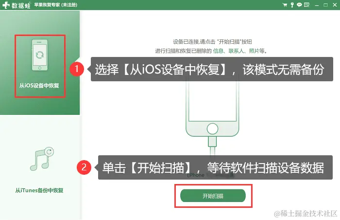 步骤3:在软件首页选择【从iOS设备中恢复】,该模式无需备份,可直接扫描设备来恢复数据,软件成功识别后点击【开始扫描】。