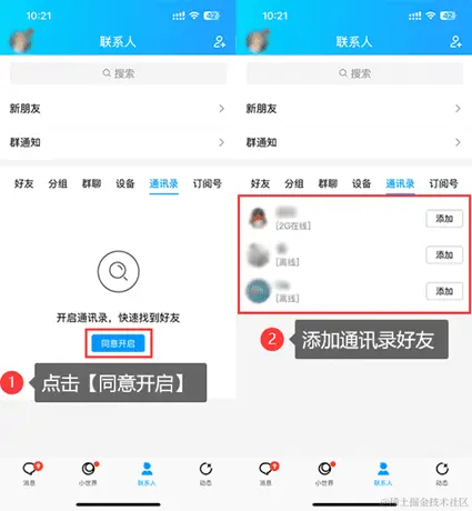 步骤2:在通讯录页面,点击【同意开启】按钮启用手机通讯录。