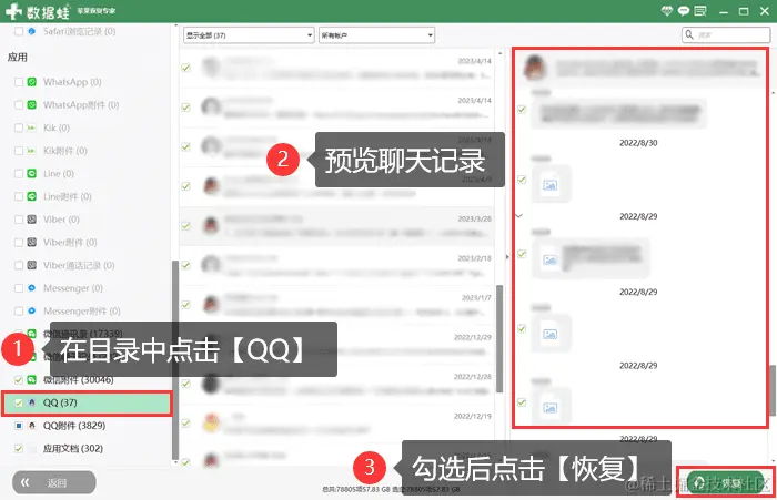 步骤4:扫描完成后,点击需要恢复的数据类型【QQ】,找到需要预览的聊天记录。在对应方框中勾选,然后点击【恢复】就可以将聊天记录恢复到电脑上了。
