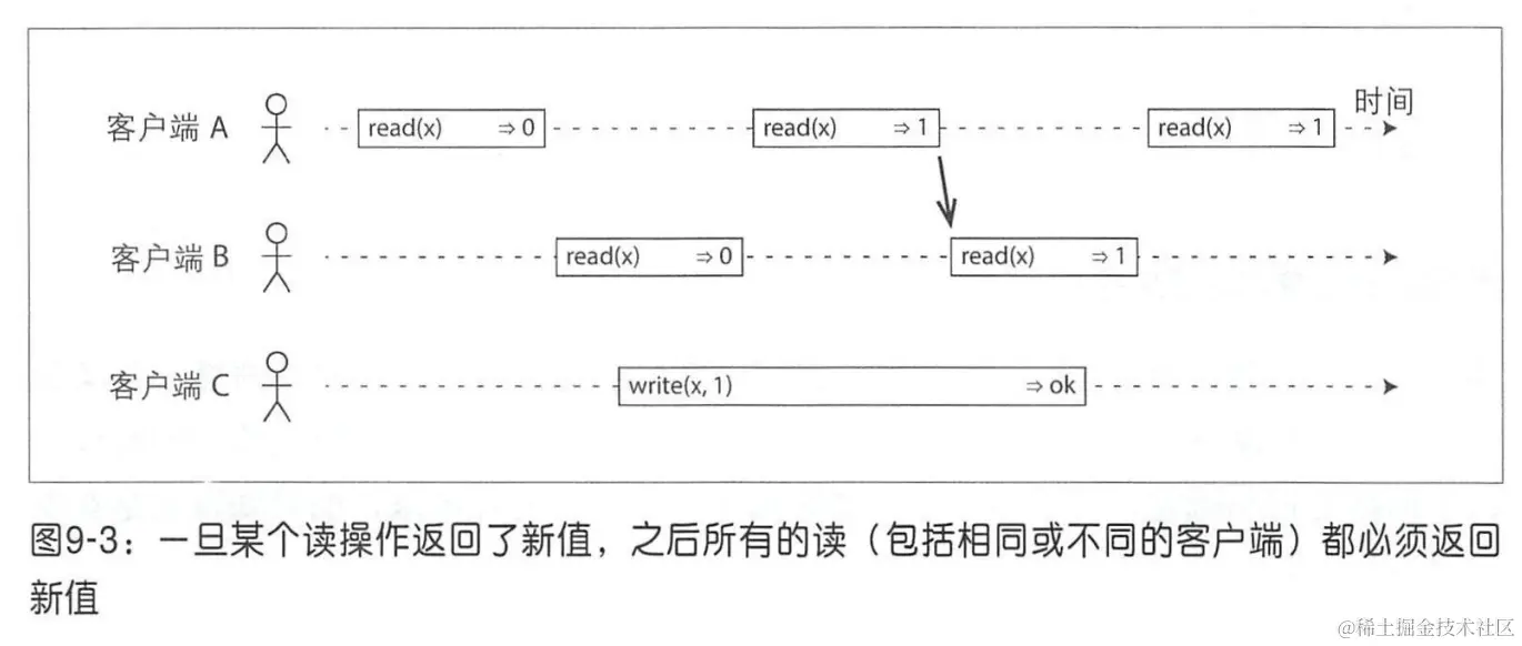 上图中使用箭头表示了这种时序依赖。客户端 A 首先读到 x 的新值 1。在 A 的读取返回之后,B 开始一个新的读。由于 B 的读请求严格在 A 的读请求之后,因此必然读到 1,尽管写下 1 的 C 的请求仍然没有返回。这和图 9-1 中的例子有点像,即在 Alice 读到世界杯结果之后,Bob 也应当能看到新消息。