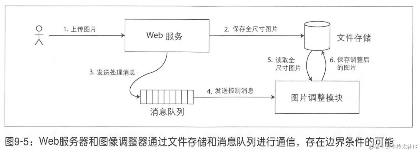 图片调整模块需要显式的指定任务,任务指令是通过消息队列由 web 服务器发给图片调整模块。但由于消息队列是针对短小消息(1kb 以下)而设计的,而图片通常有数 M,因此不能直接将图片发送到消息队列。而是,首先将图片写入文件存储,然后将包含该文件路径的调整请求发送到消息队列中。