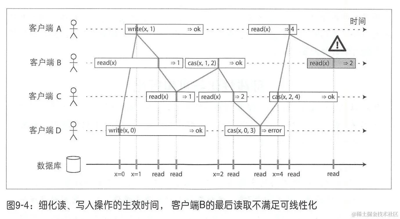 - B 读到“稍后”的值。开始时,客户端 B 首先发出一个针对 x 的读请求,然后客户端 D 发出一个设置 x = 0 的写请求,紧接着,客户端 A 发出了另一个设置 x = 1 的写请求。然后 B 读到的值却是 1。这样是合法的,并且说明数据库先处理了 D(设置 x = 0)的写请求、接着处理了 A 的写请求,最后是 B 的读请求。尽管这个序列不符合请求发出的时间点先后,但这是一个可以接受的顺序,因为这三个请求本质上并发的,因此事实上谁先谁后被处理都有可能。比如,有可能是客户端 B 的请求在网络中延迟了一些,以至于在两个写之后才被处理。