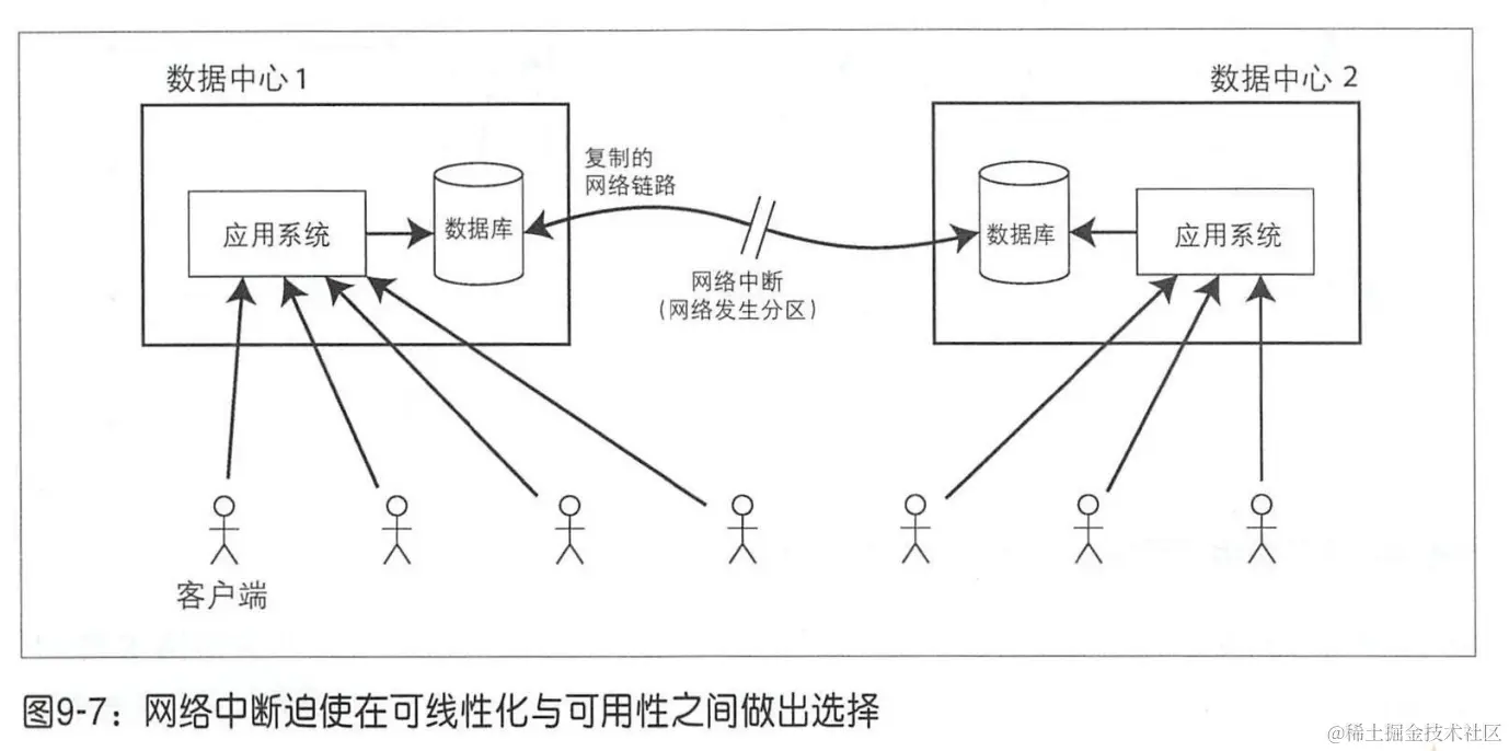 可线性化不是唯一避免静态条件的方式,但它是最易理解的。如果你能控制所有的通信渠道(如 9-5 中的消息队列,但 9-1 中的两人交谈就不行,因为在系统外),就可以使用类似读自己的写一节中所提到的手段来解决这种竞态条件。如读走 leader、使用时间戳等等增加系统复杂度的方法来换取线性一致性。