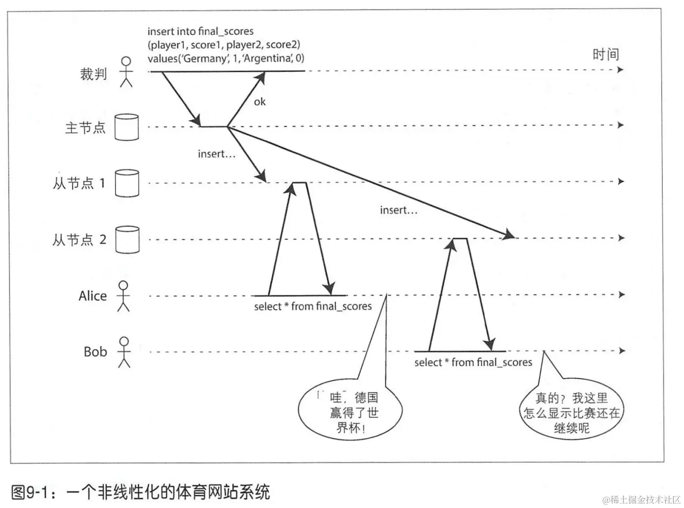 上图显示了一个非线性一致性的体育网站。Alice 和 Bob 在一间屋子里,分别通过手机来查看 2014 年国际足联世界杯的总决赛的结果。在最终比分出来后,Alice 刷新了网页,并且看到了发布的赢家信息,并且将该结果告诉了 Bob。Bob 有点难以置信,重新刷了一下网页,但是他的请求被打到了一个滞后的数据库副本上,该副本显示比赛仍在进行。