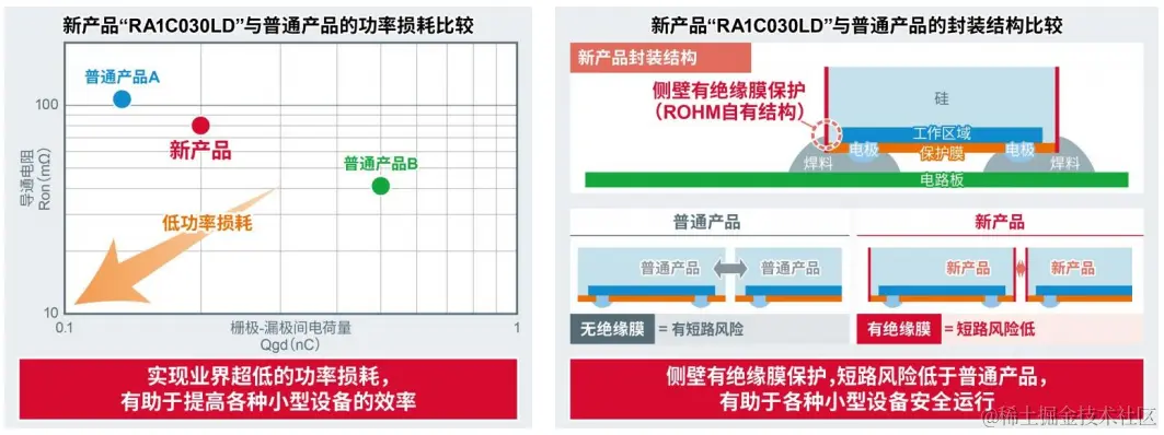 新产品采用融入了ROHM自有IC工艺的晶圆级芯片尺寸封装2DSN1006-3(1.0mm×0.6mm),在实现小型化的同时还降低了功耗。与相同封装的普通产品相比,表示导通损耗和开关损耗之间关系的指标(导通电阻3×Qgd*4)改善了20%左右,达到业内先进水平(1.0mm×0.6mm以下封装产品比较),非常有助于缩减各种小型设备电路板上的元器件所占面积并进一步提高效率。另外,还采用ROHM自有的封装结构,使侧壁有绝缘保护(相同封装的普通产品没有绝缘保护)。在受空间限制而不得不高密度安装元器件的小型设备中,使用这款新产品可降低因元器件之间的接触而导致短路的风险,从而有助于设备的安全运行。