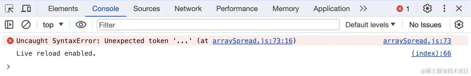 ⚠️注意:展开语法仅限于函数参数接收多个输入,或构建一个新数组。不要在模版字符串或其他函数中(如typeof())使用它,否则程序会返回一个错误,并中断程序。例如下面这个例子: