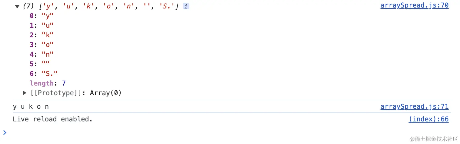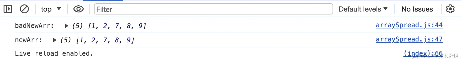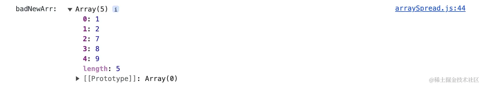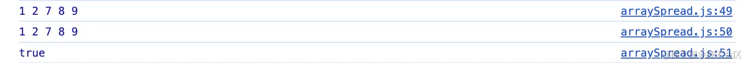 其次,如果你好奇想查看一下...newArr输出了什么结果,你会惊奇的发现,...newArr和console.log(1, 2, 7, 8, 9);都输出的形式一样,两者在内存中实际上是同一种数据类型。
