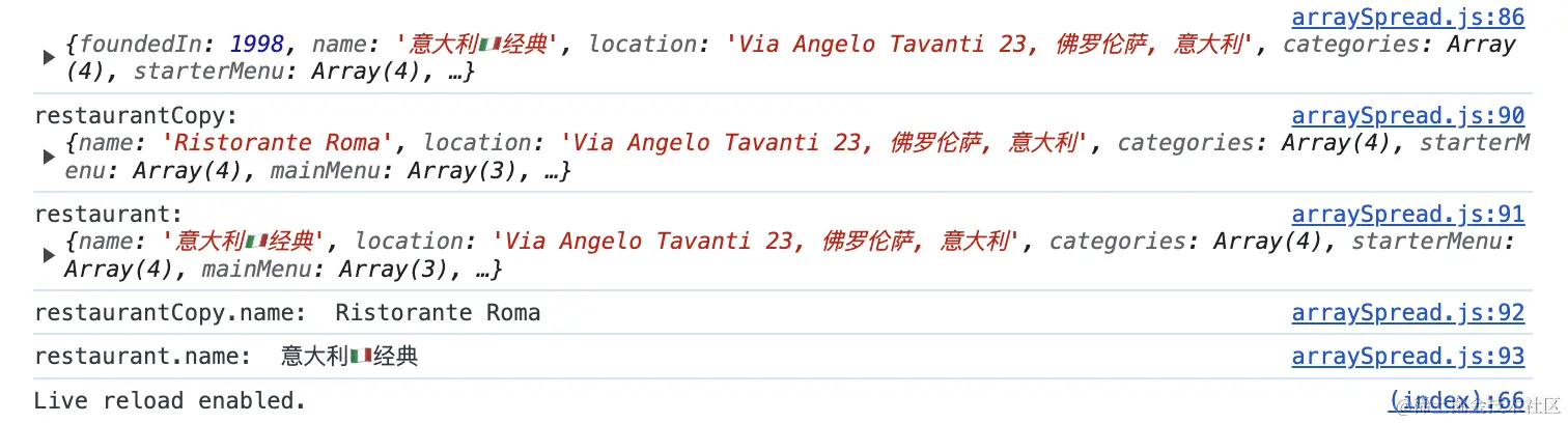 另外扩展语法还经常被用于对象的复制。并且通过扩展语法复制出的对象实际上是对目标对象的深拷贝,并非简单的为对象(使用Object.assign()方法)创建一个副本。例如下面这个例子🌰,利用展开语法将对象restaurant中的属性和值全部复制到了restaurantCopy对象中。接着单独对刚刚复制的对象restaurantCopy下的name属性命名为Ristorante Roma。你会发现restaurantCopy下的name与restaurant下的name并不是一个。这证明通过展开语法复制出的对象是一种深拷贝。