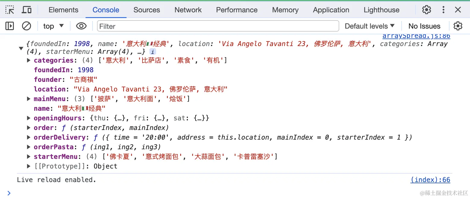为了更加贴近用户的输入数据的方式,这里使用浏览器BOM的prompt框来接收用户的输入。在过去的老版本中,用户输入完菜品后,需要依次调用ingredients数组对应的索引。但如果你使用了ES6全新的方法,你可以直接使用展开语法即可调用ingredients数组内的全部内容。
