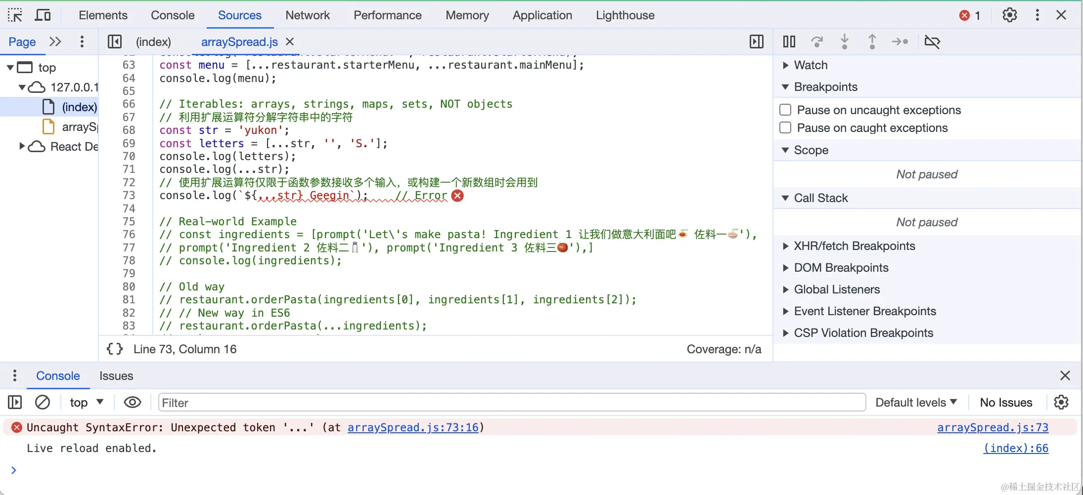 另外,在JavaScript中可以对具有迭代类型的对象和函数使用展开语法。例如数组(Array)、字符串(String)、map、集合set()可以使用展开语法...,注意不能对非迭代对象和函数使用展开语法...,否则可能会产生程序错误🙅。