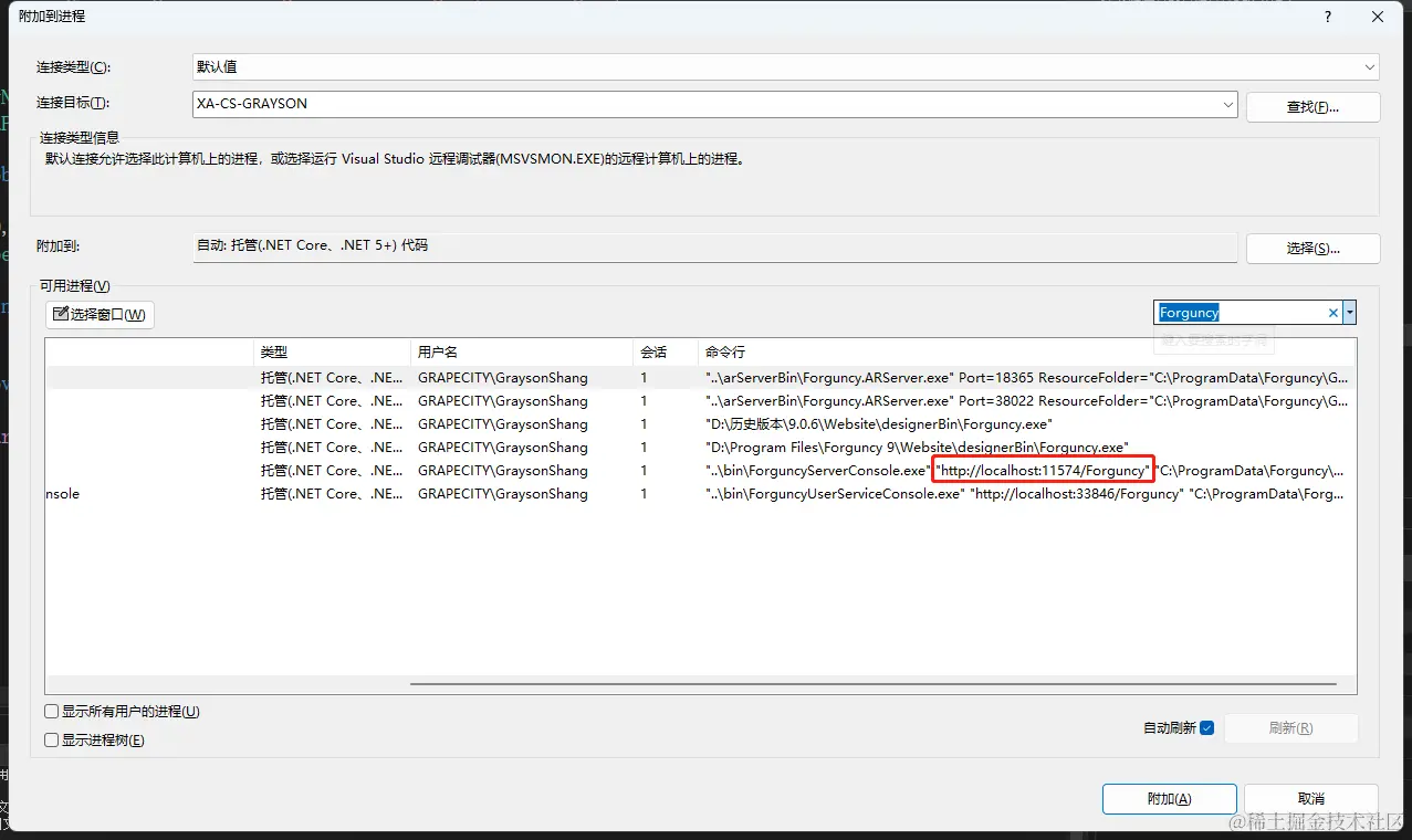 点击进去,然后在搜索栏,输入Forguncy,就可以看到和活字格相关的所有进程信息了,然后在命令行一列找到我们前面记录有对应的端口号的URL,然后点击附加,就可以正常调试了。