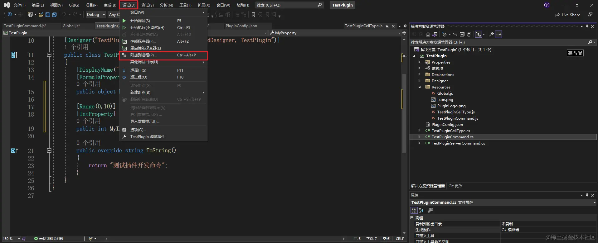 在Visual Studio中操作如下(首先得有对应插件源代码),点击菜单栏的调试,找到附加到进程。