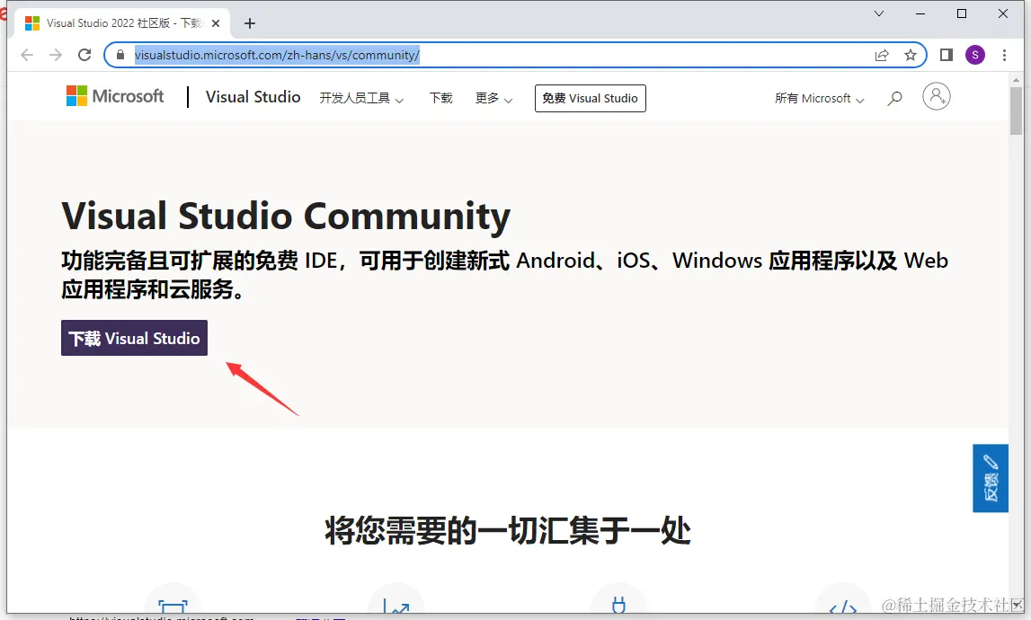 打开链接visualstudio.microsoft.com/zh-hans/vs/…,点击“下载Visual Studio按钮”。