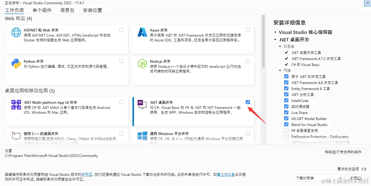下载后双击打开,看到以下界面, 勾选".Net 桌面开发",其他保持默认配置,点击Next即可。
