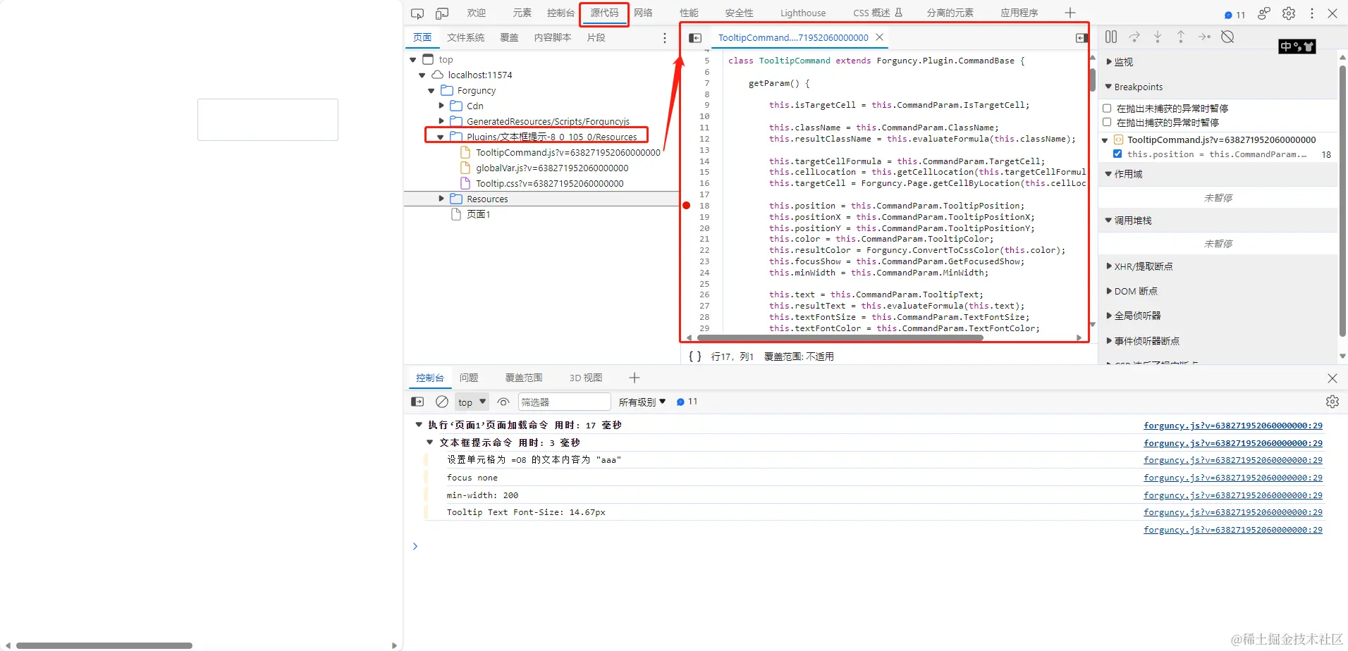 前端代码调试比较简单,当活字格安装好插件之后,直接在活字格运行应用就可以调试,而调试工具就是浏览器,在活字格页面执行完插件命令之后,在浏览器源代码里,找到Forguncy,下的Plugin对应插件名称下的JS文件,就可以直接打断点调试了。
