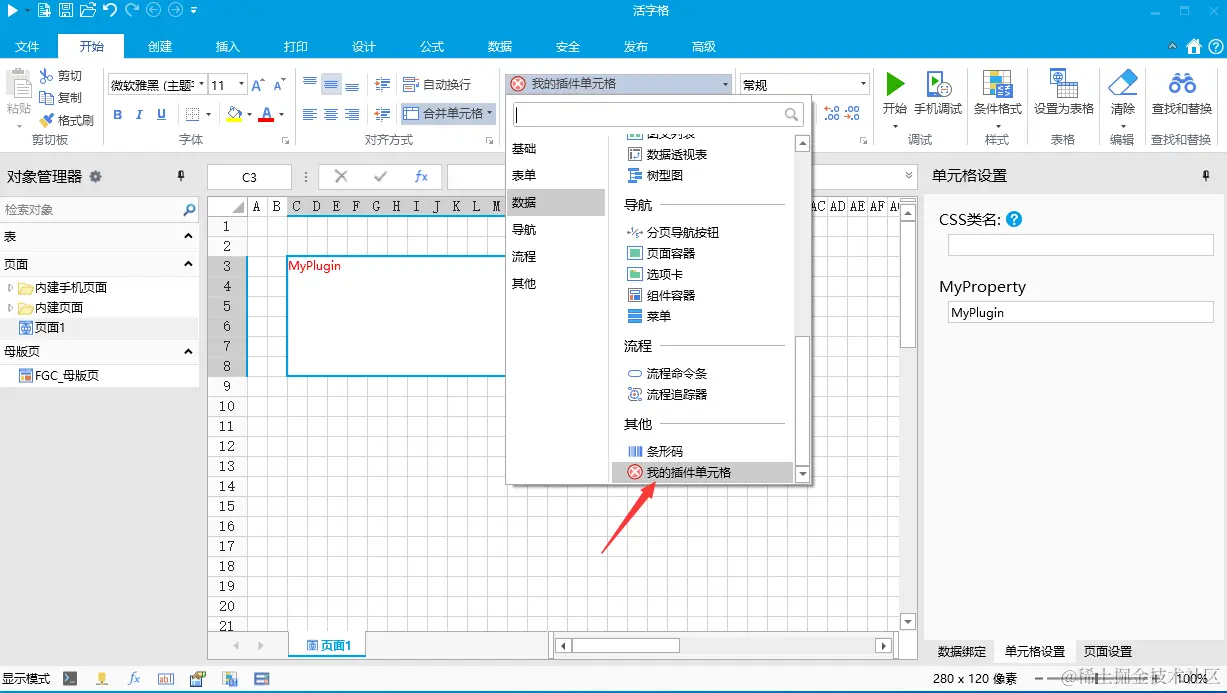 编译成功后,打开活字格设计器,在单元格类型选择下拉列表中可以看到多了一个单元格类型“我的插件单元格”,第一个插件已经开发完成了。