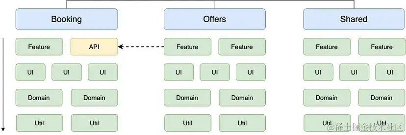 每个子域使用分层架构,这些子域之间的交互使用 API。功能包括智能组件和服务、用户界面(UI)、哑组件、域模型和 Util 所有实用功能,这些功能都在此边界上下文中使用。我们已经很接近了,但还没到那一步。仅有架构是不够的,底层组件和业务逻辑也必须使用清洁代码原则。因此,让我们放大功能层和用户界面层。