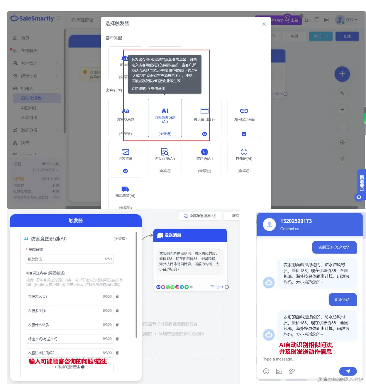 在SaleSmartly菜单栏【机器人】-自动化流程中新增AI访客意图识别触发器,这个功能是全渠道通用的(包括在线聊天(LiveChat)、WhatsApp、Facebook Messenger、Instagram、Telegram、Email、Wechat、LINE这些渠道)。这一技术主要是基于OpenAI的 ChatCPT-4.0。