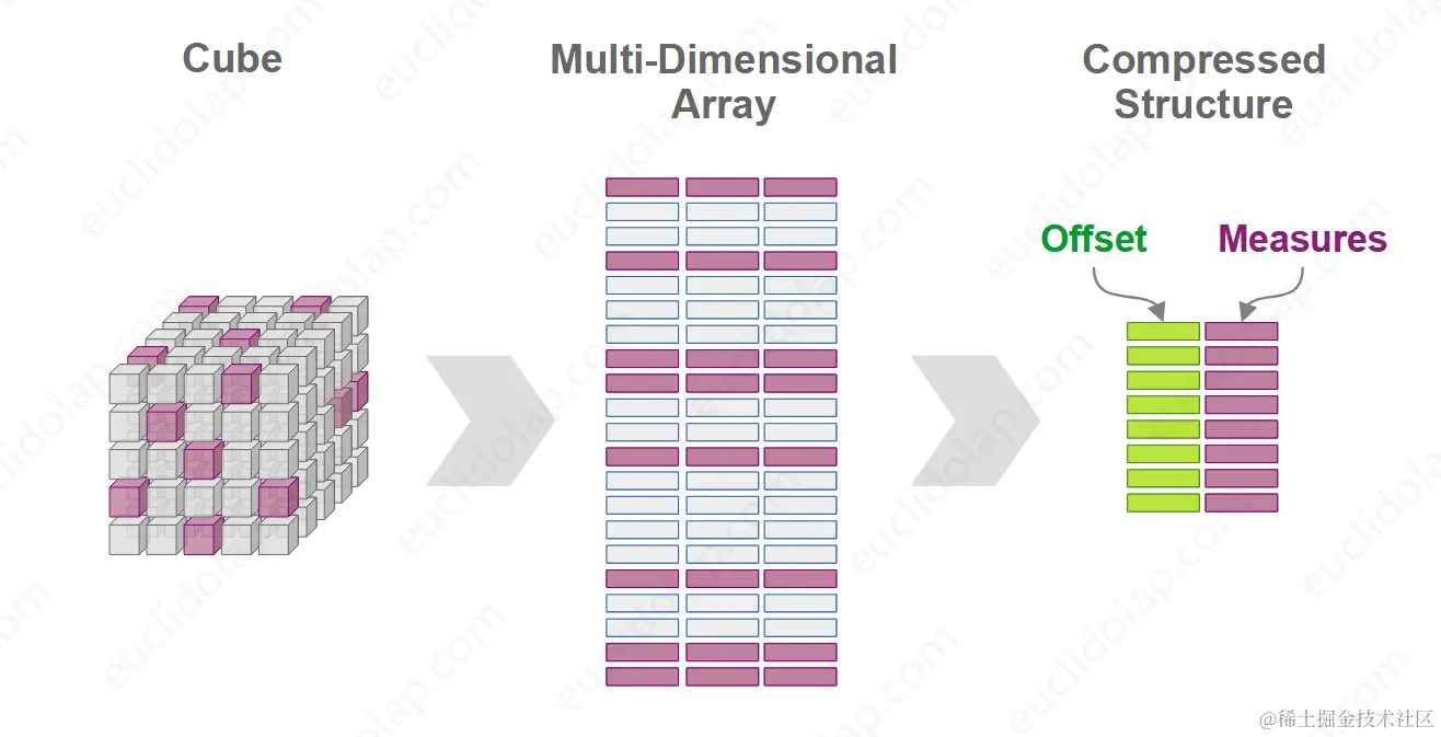 在逻辑模型层面,你还是可以将EuclidOLAP Cube中的度量数据想象成是存储于一个有着大量数据空洞的巨大的多维数组之中。