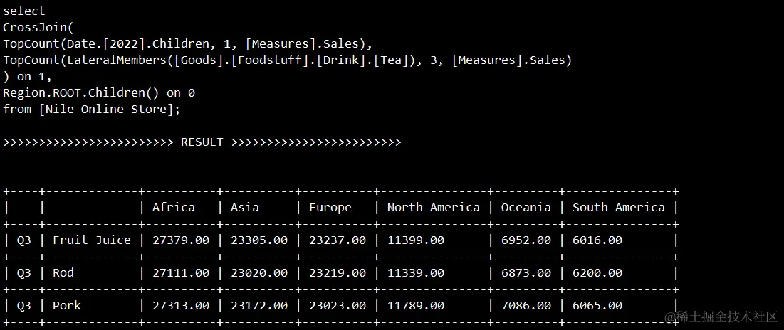 它将按地区查询2022年总体销售额最高的那个季度的前三种畅销商品的销售数据: