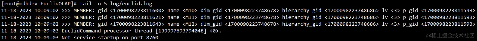 当日志中显示了Net service startup on port 8760内容时表示EuclidOLAP已经成功运行。