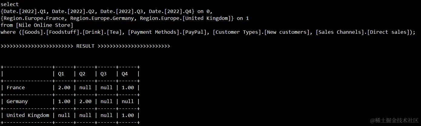 它没有在日期和地区之外的其他维度进行限定,该查询将在其他四个维度上进行汇总。日期和地区维度分别指定了年份和洲级别的维度成员,这要比第二个MDX具有更高的汇总粒度。