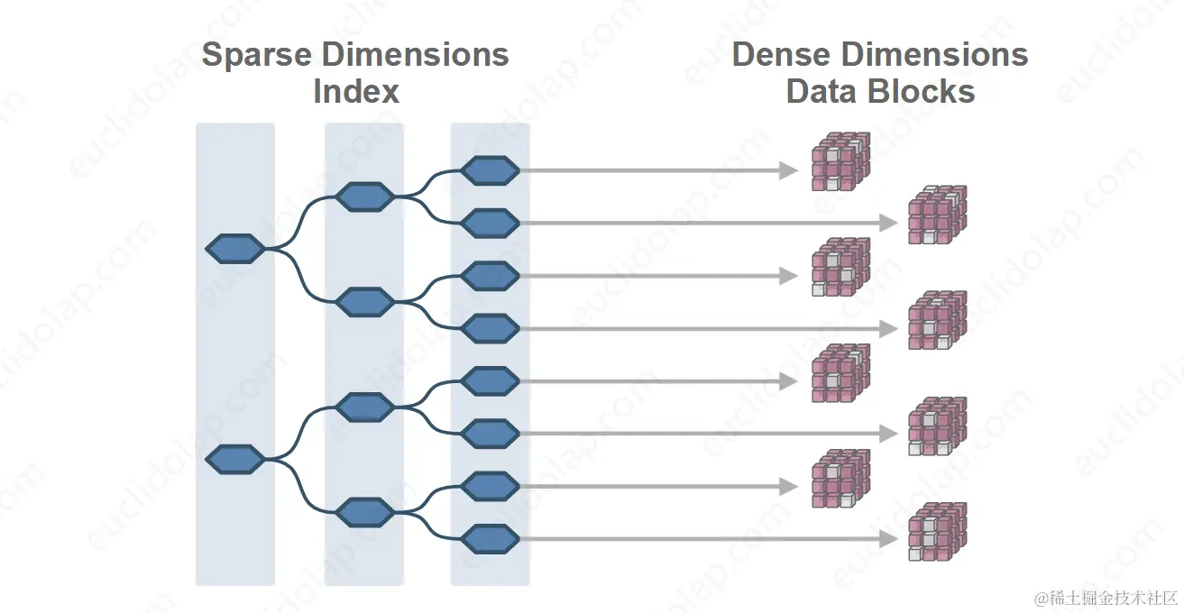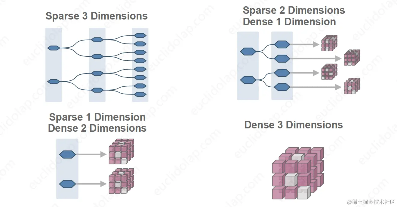 维度就相当于坐标轴,你可以将一个关联个N个维度的Cube想象成一个N维立方体,同时把所有度量值想象成是存储于一个多维数组中。多维数组结构会带来一个严重的问题——内存容量爆炸,为了解决这个问题,像Cogons、Essbase这些传统多维数据库的解决办法是采用稀疏维和密集维结构:稀疏的几个维度被构建为索引,密集的维度则被构建为数据块——相对密集的更小的多维数组。