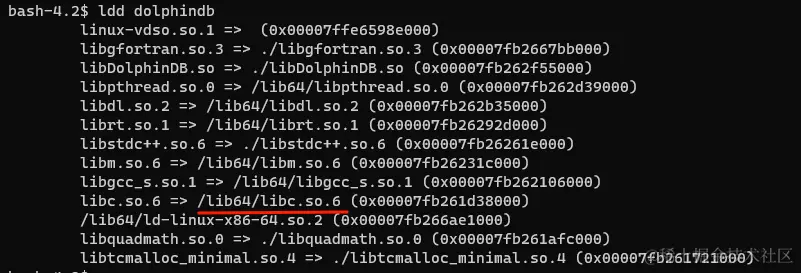 使用 ldd dolphindb 命令验证当前 glibc 库的路径。当运行结果显示其路径为高版本 glibc 路径时,说明前述修改成功。