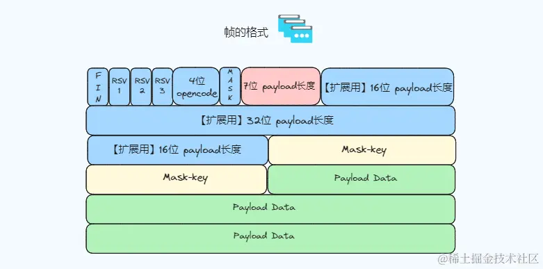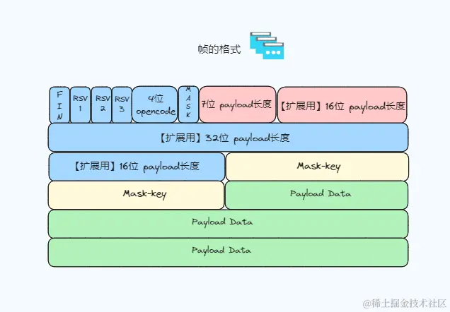 - Payload data 帧真正要发送的数据,可以是任意长度