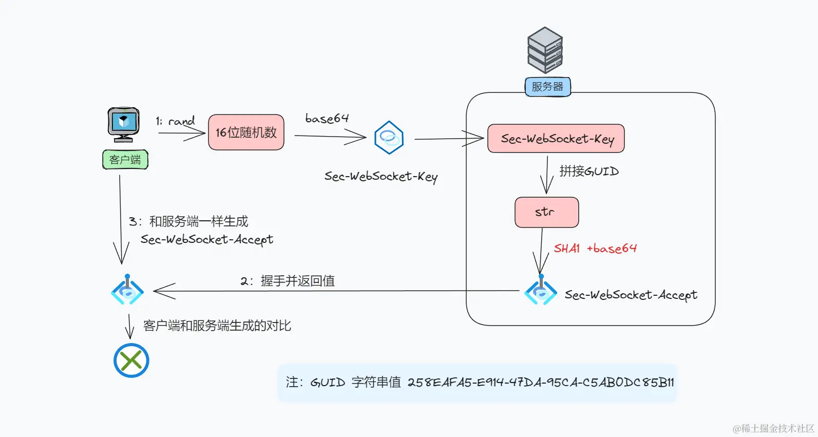 - 客户端也必须按照服务端生成 Sec-WebSocket-Accept 的方式一样生成字符串,与服务端回传的进行对比