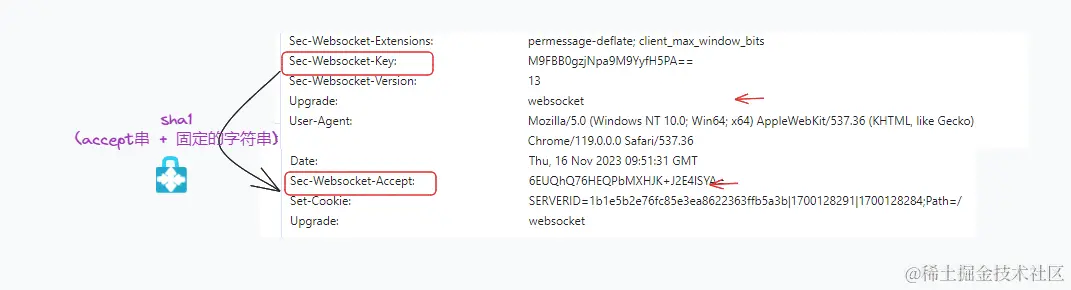 服务端返回的响应头字段 Sec-WebSocket-Accept 是根据客户端请求 Header 中的Sec-WebSocket-Key计算出来。