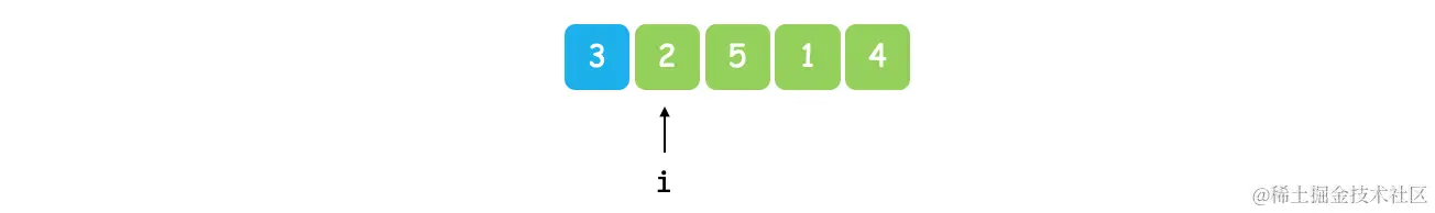 明白了选择排序的流程,接下来再来看一下插入排序。用一句话描述插入排序的算法流程:先将数组的第0个元素看成是一个有序的子数组,然后从第1个元素开始将元素逐个插入有序部分,直到整个数组全部有序为止。还是以上面的数组为例,[3, 2, 5, 1, 4],首先将数组的第0个元素看成是有序部分,设置一个指针i指向数组的第1个位置,意思是现在想要将第1个元素2插入到前面数组的有序部分。
