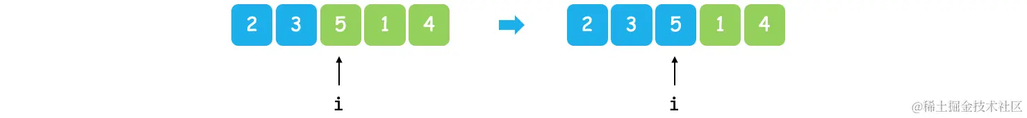 接下来将i指针右移一位,指向2位置的5,意味着现在要将2位置的5插入到前面的有序部分中。5和前面的3做比较,发现5 > 3,这次循环到这里就可以直接结束了,数组的有序部分变成了nums[0...2]