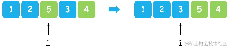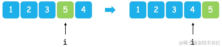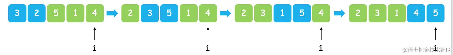 i指针继续右移,指向4位置的4,4小于左侧的5,所以交换位置,再和左侧的3比较,发现4 > 3,本次循环直接结束。此时i已经指向元素中最后一个位置了,整个数组已经有序,流程结束。