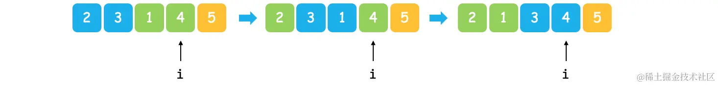 接下来在数组的无序部分nums[0...2]继续冒泡,0位置的2和1位置的1做比较,交换位置,数组变成[1, 2, 3, 4, 5],1位置的2和2位置的3做比较,不交换位置,循环结束。