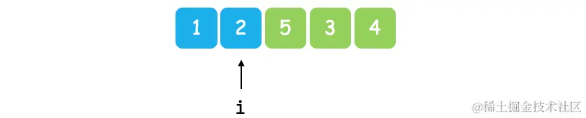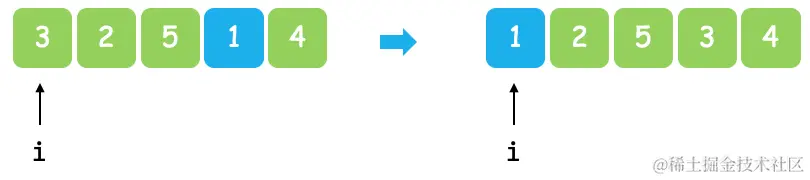 i指针继续右移,指向2位置的5,j指针在2, 3, 4三个位置查找最小值,发现是3位置的3,所以将它和2位置的5交换位置,数组变成[1, 2, 3, 5, 4]