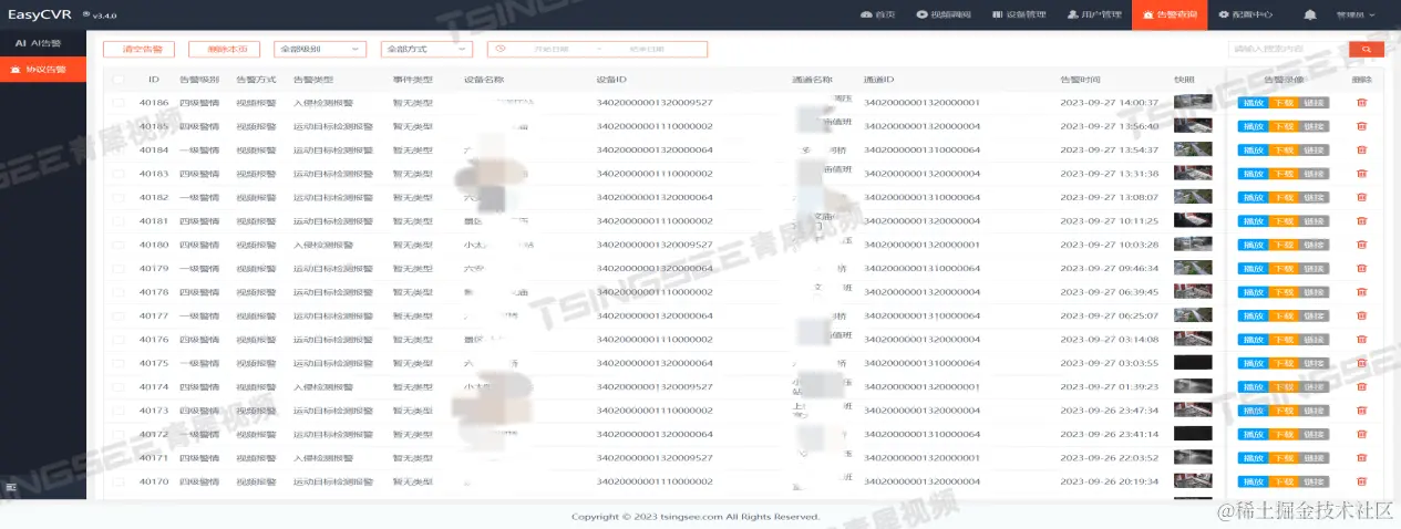 视频监控汇聚平台EasyCVR可拓展性强、视频能力灵活、部署轻快,可支持的主流标准协议有国标GB28181、RTSP/Onvif、RTMP等,以及支持厂家私有协议与SDK接入,包括海康Ehome、海大宇等设备的SDK等。平台既具备传统安防视频监控的能力,也具备接入AI智能分析的能力,包括对人、车、物、行为等事件的智能追踪与识别分析、抓拍、比对、告警上报、语音提醒等。感兴趣的用户可以前往演示平台进行体验或部署测试。