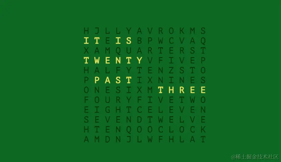 在这个时钟中,当前时间通过文本显示,显示的文本时间误差为+/- 4分钟,以明亮的颜色突出显示当前时间,而其余字母则较暗。